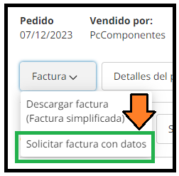 No pedido → botão “Fatura” → opção “Solicitar fatura com dados”.